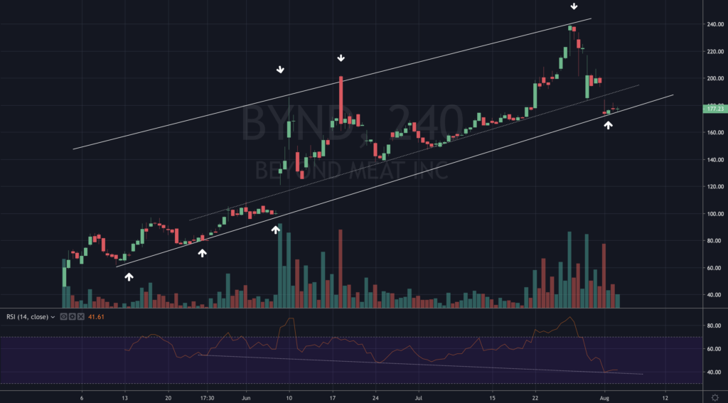 There are two lines you need to pay attention too. The upper one is showing a somewhat apparent resistance. The lower trend line is the more important one, the support. Most trades we take are either at breakouts, or at support. Chances are BYND will bounce on support.